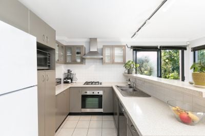 - Modern kitchen with stainless steel appliances & stone benchtops