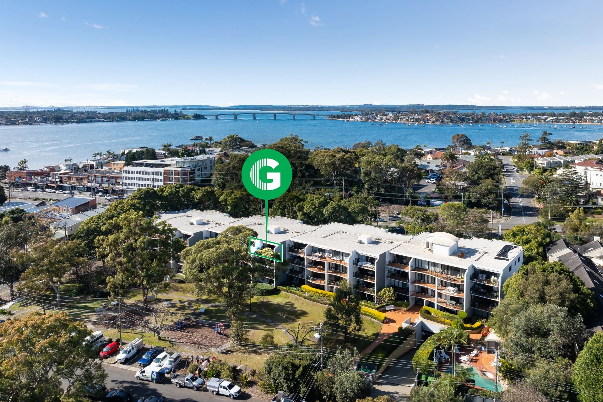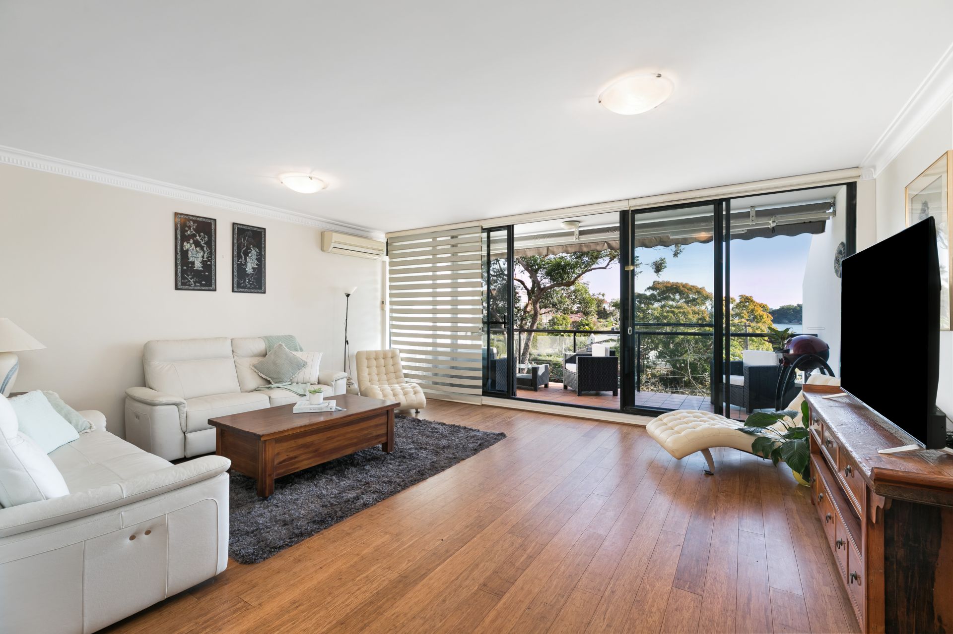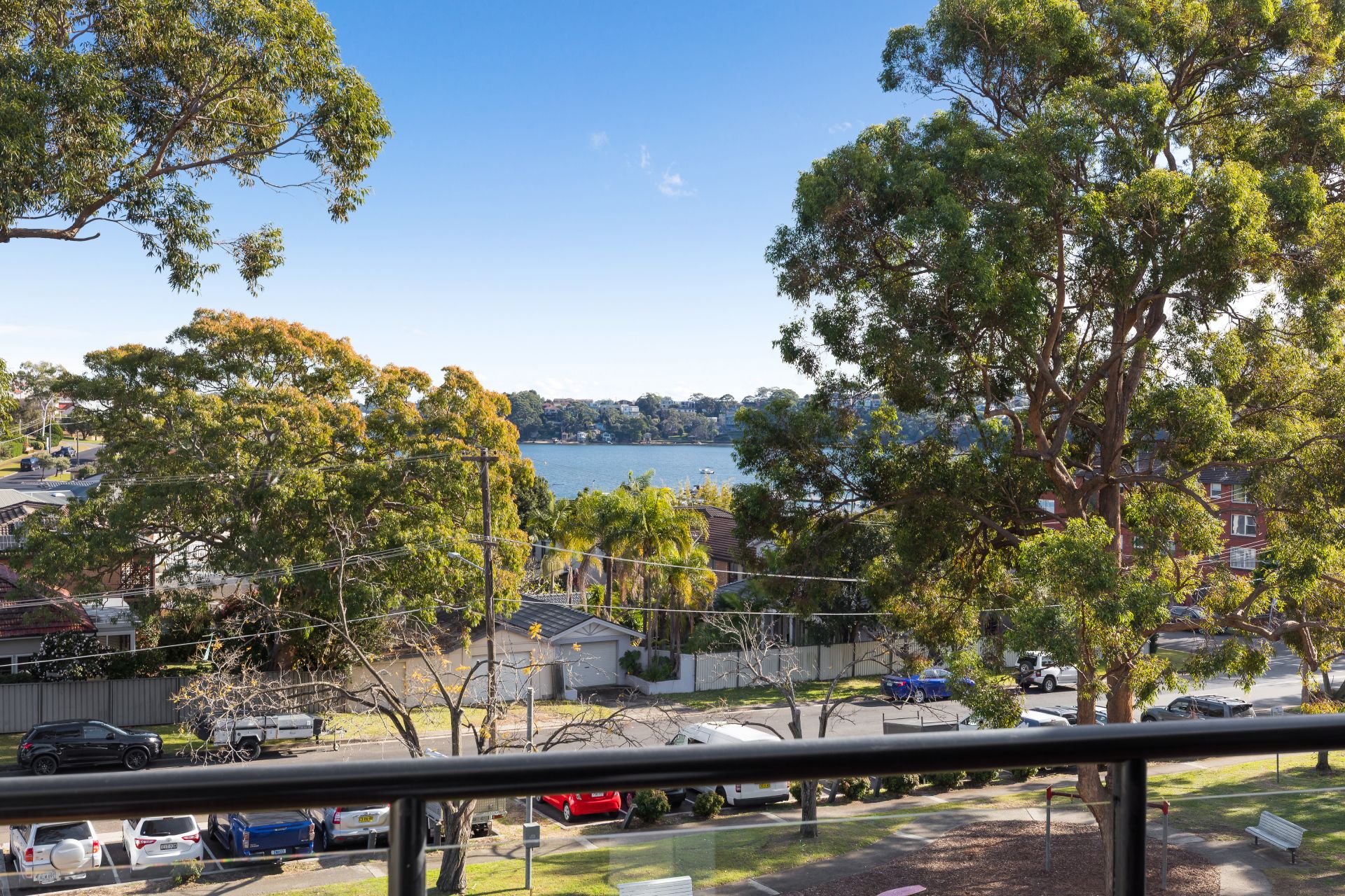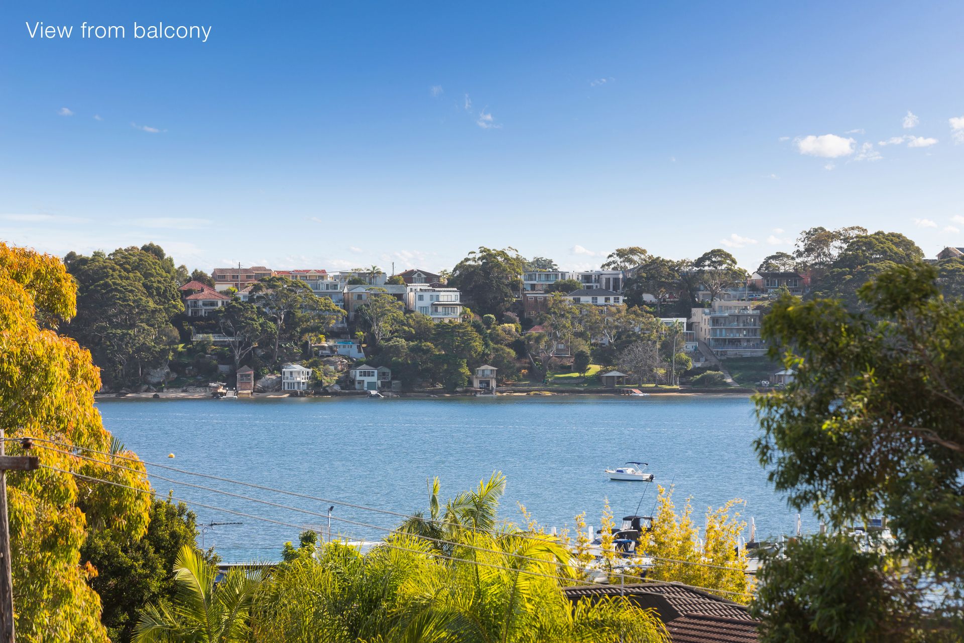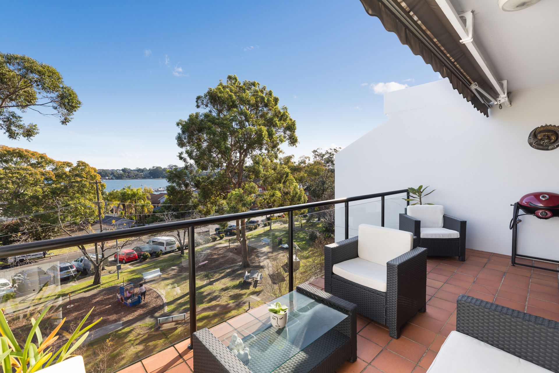 - Expansive balcony with leafy outlook and water views